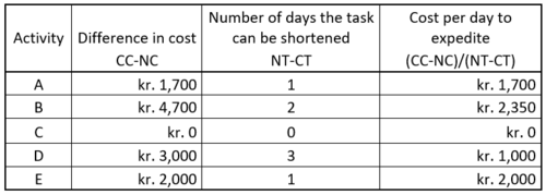 From the data in Table 2 the cost per day to expedite the project can be computed as shown in Table 3.